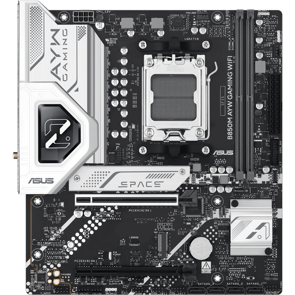 B850M AYW GAMING WIFI ASUS B850 series motherboards are expertly engineered to unleash the full potential of AMD Ryzen™ 9000 series processors. The B850M AYW GAMING WIFI motherboard provides users and PC DIY builders with a range of performance optimizations via intuitive software and firmware features. It's designed to be Advanced AI PC-ready, offering the power and connectivity needed for demanding AI applications.