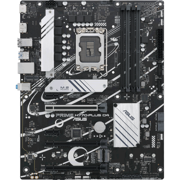 ASUS Prime H770-PLUS D4, an Intel® H770 LGA 1700 ATX motherboard with PCIe 5.0, three PCIe 4.0 M.2 slots, DDR4, Realtek 2.5Gb Ethernet, DisplayPort, HDMI®, SATA 6 Gbps, USB 3.2 Gen 2 Type-C®, Thunderbolt™ (USB4®) support, Aura Sync