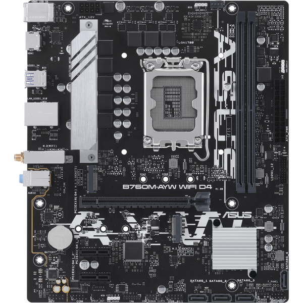 B760M-AYW WIFI D4 ASUS B760M-AYW WIFI D4, an Intel® B760 LGA 1700 mATX motherboard with PCIe 4.0, two PCIe 4.0 M.2 slots, DDR4, Realtek 2.5Gb Ethernet, WiFi 6, HDMI®, SATA 6 Gbps, front USB 3.2 Gen 1, Aura Sync - Ready for Advanced AI PC: Designed for the future of AI computing, with the power and connectivity needed for demanding AI applications- Intel® LGA 1700 Socket: Ready for 14th, 13th and 12th Gen Intel® processors- Ultrafast Connectivity: PCIe 4.0, two PCIe 4.0 M.2 slots, Realtek 2.5Gb Ethernet , WiFi 6 and front USB 3.2 Gen 1 support- Comprehensive Cooling: VRM heatsink, PCH heatsink, hybrid fan headers and Fan Xpert- Aura Sync RGB Lighting: Onboard Addressable Gen 2 headers and Aura RGB header for RGB LED strips, easily synced with Aura Sync-capable hardwares