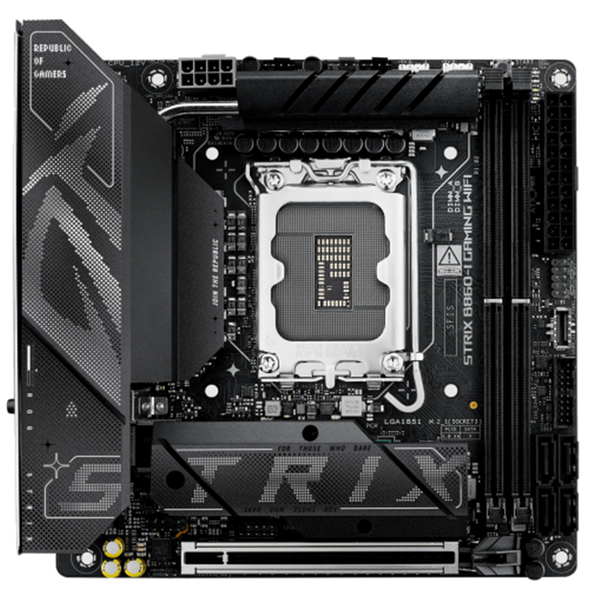 ASUS AI ADVISOR Using AI technology to understand natural-language questions or scenario descriptions, ASUS AI Advisor allows users to explore the functionality and advanced features of ASUS motherboards in a simple and straightforward way. AI NETWORKING II AI Networking II combines intelligent technologies to continuously optimize network performance, provide trustworthy and seamless connectivity, and unleash the full speed of WiFi 7*. NPU BOOST The integrated NPU in Intel® Core™ Ultra Processors (Series 2) efficiently accelerates AI workflows - and NPU Boost lets you do more with it. This BIOS feature overclocks the NPU with just one click, increasing performance by up to 24%. Asynchronous Clock For next-level frequency flexibility, the ROG Strix B860-I features a built-in clock generator that isolates CPU base clock from memory, NPU, D2D and NGU. Drive memory, NPU and others performance to their absolute brink while maintaining the stability of CPU clock domains.Separate CPU BCLK from other domains for unfettered overclocking. DDR5 DOMINATION Enhanced signal routing can push enthusiast-grade kits well beyond the 9 GT/s threshold on the Strix B860-I. AEMP III ASUS Enhanced Memory Profile III (AEMP III) is an advanced firmware feature that empowers users to achieve unparalleled memory performance with cutting-edge CUDIMM memory. DIMM FIT DIMM Fit is an ASUS-exclusive BIOS feature that precisely analyzes individual memory modules to optimize performance and pinpoint potential issues. M.2 HEATSINKS Heatsinks cover every slot to help keep onboard NVME SSDs at optimal temperatures for consistent performance and reliability. VRM HEATSINK The VRM heatsink extends over the rear I/O to maximize surface area and deftly handle the power thermals of the latest Intel processors, while leaving clearance for large CPU coolers. HIGH-CONDUCTIVITY THERMAL PADS High-quality thermal pads are utilized between power stages and heatsinks, helping to improve heat transfer and reduce VRM operating temperatures. WIFI 7 The revolutionary WiFi 7 is faster than standard WiFi 6*, thanks to tech like 160 MHz channels** on the 6GHz band and 4K QAM*. Multi-Link Operation (MLO) provides a more stable WiFi connection and lower latency, unlocking the realms of the unknown in gaming, streaming and industrial IoT. PCIE 5.0 The Strix B860-I offers end-to-end PCIe 5.0 support, and the topmost x16 expansion slot is protected with a SafeSlot retention bracket to bear the weight of the latest graphics cards. One onboard M.2 slot is rated for blistering read and write speeds up to 16 GB/s, while the remainder can deliver still-impressive 8 GB/s transfers. And every M.2 slot is covered with substantial heatsinks to dispatch the heat of next-gen drives.?