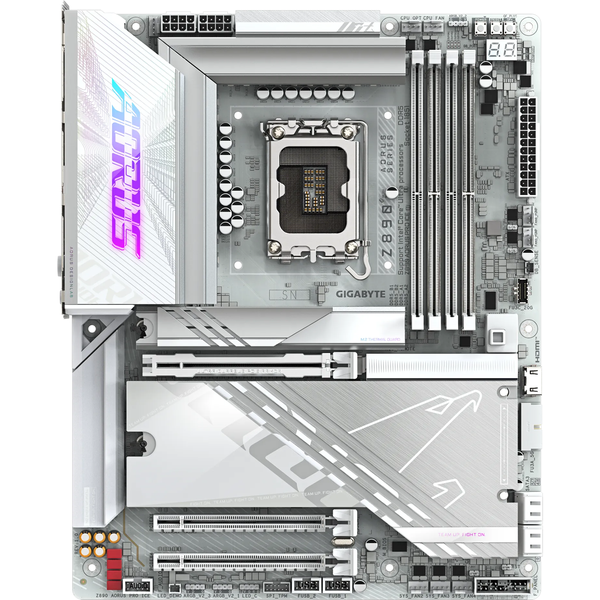 Z890 AORUS PRO ICE - Supports Intel® Core™ Ultra processors (Series 2)- Digital twin 16+1+2 phases VRM solution- D5 Bionic Corsa for Infinite Memory Performance- AORUS AI SNATCH : Auto-Overclocking Software by AI models- AI Perfdrive : Provides optimal and customized BIOS preset profile for users- Premium Compatibility : 4*DDR5 with XMP Memory Module Support- DDR Wind Blade : Enhanced Active Cooling for Memory Modules- WIFI EZ-Plug : Quick and easy design for Wi-Fi antenna installation- EZ-Latch Plus : PCIe and M.2 slots with Quick Release &; Screwless Design- EZ-Latch Click : M.2 heatsinks with screwless design- Sensor Panel Link : Onboard video port for hassle-free in-chassis panel setup- Friendly UI : Multi-Theme, AIO Fan Control, and Q-Flash Auto Scan in BIOS and SW- New Power Monitor in HWinfo for real-time monitoring on CPU power phases- Ultra-Fast Storage : 5*M.2 slots, including 1* PCIe 5.0 x4- Efficient Thermal : VRM Thermal Armor Advanced &; M.2 Thermal Guard L- Fast Networking : 5GbE LAN &; Wi-Fi 7 with directional Ultra-high gain antenna- Extended Connectivity : Dual THUNDERBOLT™ 4 Type-C with DP-Alt- High-Res Audio : ALC1220 &; WIMA Audiophile Grade Capacitors- Ultra Durable PCIe Armor : The metal back plate of PCIe x16 slot for enhanced durability- PCIe UD Slot X : PCIe 5.0 x16 slot with 10X strength for graphics card
