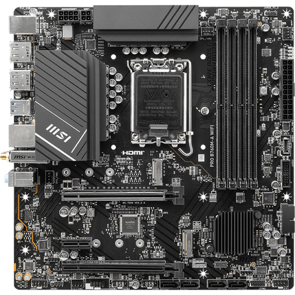 PRO B760M-A WIFI - Support Intel® Core™ 14th/ 13th/ 12th Gen Processors, Intel® Pentium® Gold and Celeron® Processors for LGA 1700 socket- Supports DDR5 Memory, Dual Channel DDR5 6800+MHz (OC)- Enhanced Power Design: 12+1 Duet Rail Power System with P-PAK, 8-pin + 4-pin CPU power connectors, Core Boost, Memory Boost- Premium Thermal Solution: Extended Heatsink, MOSFET thermal pads rated for 7W/mK and additional choke thermal pads are built for high performance system and non-stop gaming experience- High Quality PCB: 6-layer PCB made by 2oz thickened copper- Lightning Fast Game experience: PCIe 4.0 slot, Lightning Gen 4 x4 M.2- Intel Turbo USB 3.2 Gen 2: Powered by Intel USB 3.2 Gen2 controller, Turbo USB ensures an uninterrupted connection with more stability and fastest USB speeds- 2.5G LAN with Wi-Fi 6E Solution: Upgraded network solution for professional and multimedia use. Delivers a secure, stable and fast network connection- AUDIO BOOST: Reward your ears with studio grade sound quality for the most immersive gaming experience PRO B790M-A WIFI PRO B760M-A WIFI is designed with tons of flexible tools and convenient Wi-Fi solution with DDR5 memory version.
