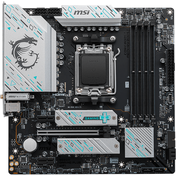 B650M GAMING PLUS WIFI - Supports AMD Ryzen™ 9000 / 8000 / 7000 Series Desktop Processors- Supports DDR5 Memory, up to 7200+(OC) MHz- Enhanced Power Design: 10+2+1 Duet Rail Power System, dual 8-pin CPU power connectors, Core Boost, Memory Boost- Lightning Fast Game experience: PCIe 4.0 slot, Lightning Gen4 M.2, USB 3.2 Gen 2- Premium Thermal Solution: Extended Heatsink Design and M.2 Shield Frozr are built for high performance system and non-stop works- AUDIO BOOST: Reward your ears with studio grade sound quality for the most immersive gaming experience- High Quality PCB: 6-layer PCB made by 2oz thickened copper B650M GAMING PLUS WIFI B650M GAMING PLUS WIFI is designed with tons of connectivity, flexible tools, and convenient Wi-Fi solution with DDR5 memory version for gamers who want it all.