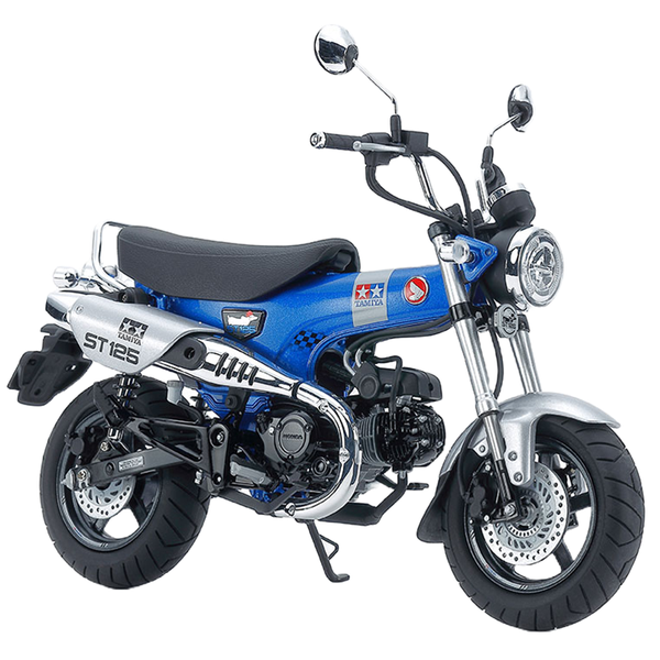 About the HONDA Dax125 Honda's Dax traces its history back to its debut in 1969, and in March 2022 the Dax was brought right up to date with the Dax125, a model which still draws heavily on the original's identity with facets such as the T-bone frame. Its 123cc engine is paired with a 4-speed transmission that can be shifted without rider clutch input, making it an excellent touring option. Tamiya 14142 1/12 HONDA Dax 125 EDTN - The unique Dax form is captured in style, with a parts breakdown designed for easier assembly and painting jobs. - The 123cc 4-stroke single cylinder engine is depicted in detail. - Engine, swing arm and front fork are attached to the frame using screws. - Metal-plated parts recreate muffler guard, side cover and more. - The rear damper has a metal spring. - Treaded synthetic rubber tires. - Choose whether to assemble as a standard version or the Tamiya Limited Edition. - Comes with a 1/12 scale helmet. The Dax's T-bone frame is simply iconic, and naturally forms the centerpiece of this model.