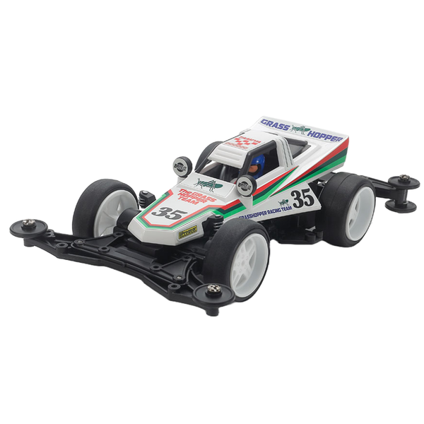 Tamiya 18105 MINI 4WD GRASS HOPPER Jr. (VZ) This assembly kit creates The Grasshopper Jr., an exciting Mini 4WD car that is based upon the legendary 1984 R/C car and 40-year Tamiya mainstay of the same name. The elegantly streamlined Grasshopper form looks great shrunk down to Mini 4WD car size, and its single seater buggy-inspired slimline form with foglamps is accented with a driver figure. Logos and numbers are included as stickers in the box, and the model runs on the compact VZ chassis. The VZ chassis is a compact and lightweight design that features reinforced designs for bumper, rear stay base and more ensuring that it has the durability and flexibility to withstand racing accidents. It is also a rather adaptable unit that lets its owner make numerous updates to the setup. Low friction 620 plastic bearings are molded in POM and maximize drive efficiency, while the chassis and A parts are molded in ABS. This chassis features a gear ratio of 3.5:1. - Includes motor- Easy snap-together assembly- Large-diameter slick tires (black) The packaging is inspired by that of its "big brother" R/C model.