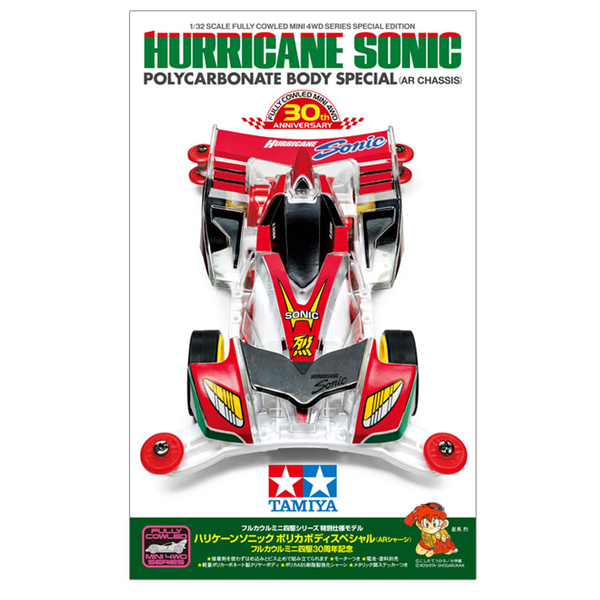 Hurricane Sonic is Retsu Seiba's third car in the legendary Mini 4WD cartoon series "Bakuso Kyodai Let's &; Go!!" and now it gets a special release in the shape of this assembly kit with a lightweight polycarbonate body. Separate parts are used for the front wing/air intake, and metallic stickers are included. The AR chassis is molded in white polycarbonate-ABS, and yellow spiral spoke wheels are paired with super hard low-profile tires. AR Chassis The AR chassis is designed to offer its driver durability, customizability and ease of maintenance, all of which are vital ingredients for a successful Mini 4WD racer. Its aerodynamic form smoothly allows air to pass through the chassis interior as the machine runs, cooling the batteries and motor and extending their effectiveness. The underpanel and diffuser can be removed from the model without taking off the body, while a low-friction rear skid bar is fitted to slash time loss experienced on tricky slope sections, and keep the racer on the track where it belongs. Features a 3.5:1 gear ratio. The inimitable Hurricane Sonic body is molded in polycarbonate, to be painted in the Tamiya Color PS-57 Pearl white. The front wing/air intake section is a separate component. The AR chassis is molded in white polycarbonate-ABS, with A parts in low-friction red plastic. It has a 3.5:1 gear ratio. Images show assembled and painted kit.