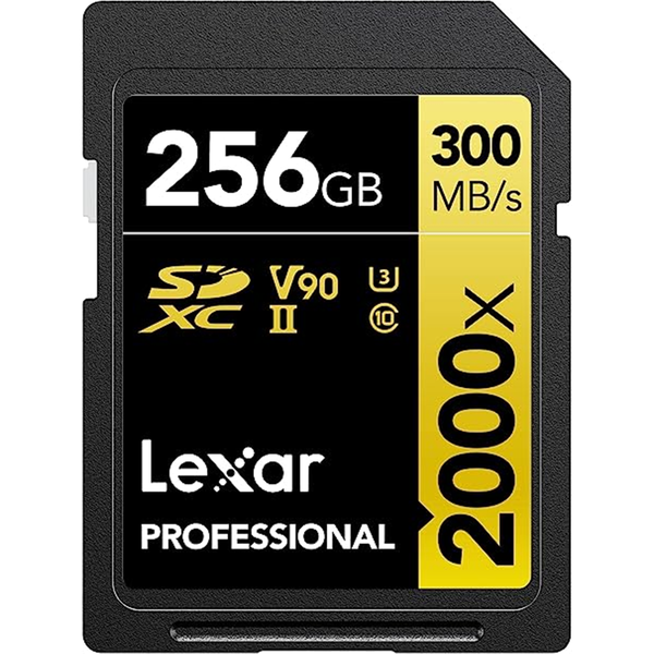 With the Lexar Professional 2000x SDHC/SDXC UHS-II Card GOLD Series, quickly capture and transfer high-quality photos and extended lengths of Full-HD and cinema-quality 8K video, with a read transfer speed up to 300MB/s . The card also leverage UHS-II technology (UHS Speed Class 3 (U3)) for high-speed performance, so you'll power through post-production with super-fast file transfer from card to computer. - 256GB Capacity- UHS-II / V90 / U3 / Class 10- Max Read Speed: 300 MB/s- Max Write Speed: 260 MB/s- Min Write Speed: 90 MB/s- Records Full HD, 3D, and 4K Video