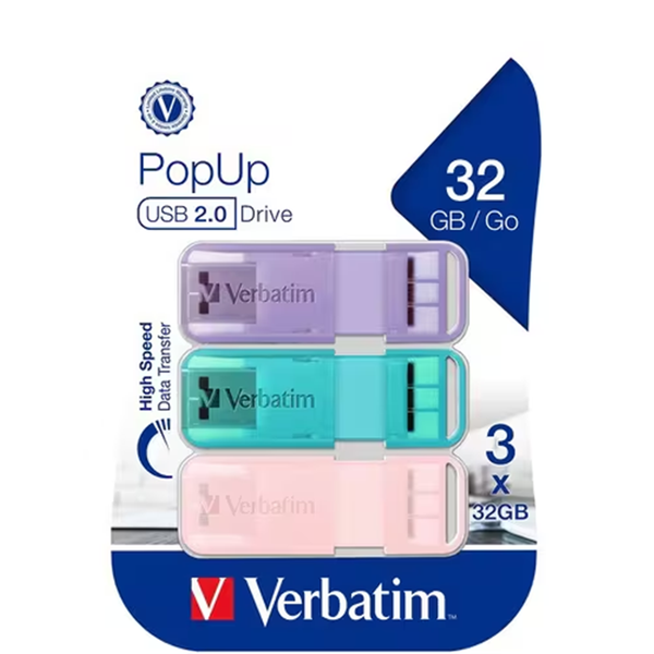 Verbatim's 32GB Store 'n' Go PopUp USB Drive is available as a convenient triple pack &; assorted bright and contemporary colours. Perfectly sized to fit in your pocket, on a keychain or lanyard, in a pencil case or your bag, it makes for easy transportation and file sharing on the go. A push-pull sliding feature protects the connector when not in use, meaning no more lost caps.