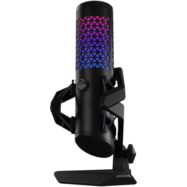 Professional cardioid condenser gaming microphone features a studio-grade 25 mm condenser capsule, 192 kHz / 24-bit sampling rate, high-pass filter, built-in pop filter, premium metal shock mount, and ASUS Aura Sync RGB lighting.