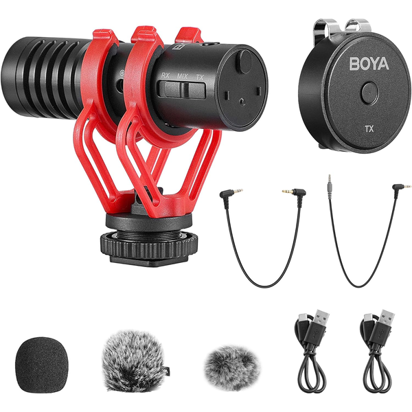 2.4GHz Wireless lavalier &; Shotgun microphone BY-MM1W is a combination microphone. There are three radio modes to choose from! Three Pickup Patterns Enjoy sound quality 98 feet pickup distance 9 hours battery life Combined storage Wide applicability