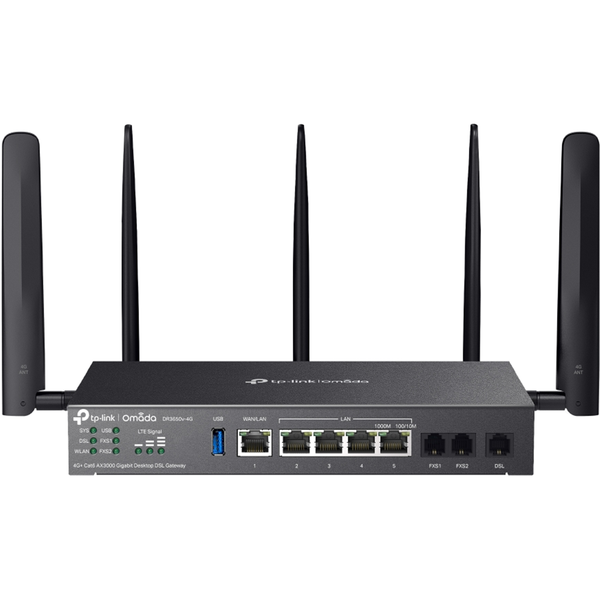 DR3650v-4G Omada 4G+ Cat6 AX3000 Wi-Fi 6 Gigabit Desktop DSL Gateway - AX3000 WiFi 6 with 2402 Mbps on 5 GHz and 574 Mbps on 2.4 GHz*1- 4G+ Cat6 up to 300Mbps- 3x RJ11 Ports (2x FXS, 1x DSL) &; 5x RJ45 Gigabit Ports &; 1x USB 3.0 Port- 2x Nano SIM for 4G/LTE Failover- VDSL2 35b: Supports 350Mbps DSL Access*2- VDSL2/ADSL2+/ADSL2/ADSL Compatibility- IPSec/PPTP/L2TP/OpenVPN/WireGuard/GRE/SSL VPN- Load Balancing Across DSL, 4G, and Ethernet WAN for Optimized Connectivity- Centralized Cloud Management- Desktop/Wall/Rack Mounting (Purchase Rackmount Kit-D226 Separately)