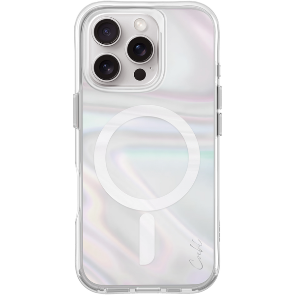 Imagine a holographic sheen that mirrors the dance of light on soap bubbles, reflecting iridescent colors with every gentle shift. Savon captures this fleeting magic, shimmering like a delicate rainbow with each subtle movement. - Translucent protection with superior hybrid impact defense- Shock-absorbing protection with raised camera lens bezel- Tough fade-resistant back with flexible bumper- Tactile, matching metallic side buttons- Made to endure impact from drops up to 8 feet- Supports magnetic wireless charging and accessories