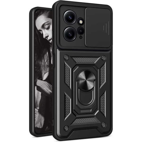 Redmi 12 LTE Rugged Kickstand Case - Black with Camera Cover Protection