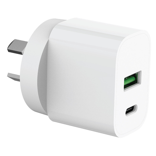 Laser USB-A and USB-C 30W Wall Charger in White This dual-port charger is designed to power two devices simultaneously, making it perfect for travel, families, or anyone managing multiple gadgets. Whether you're topping up a tablet and phone or sharing the charger with a friend, it keeps you powered and productive. - Fast charging via USB-C with Power Delivery- Dual device charging with USB-A and USB-C- Lightweight and portable - ideal for travel- Safe, smart, and reliable power output- Perfect for phones, tablets, earbuds, and more Fast Charging Technology With up to 30W delivered through the USB-C port, this charger is capable of recharging modern smartphones and tablets up to 5× faster than standard 5W chargers. It's ideal for time-critical top-ups and power-hungry devices. Charge Two Devices at Once The USB-C port supports fast charging, while the USB-A port powers legacy devices. Use both ports together to maximise convenience without sacrificing speed. Made for All Your Devices Compatible with iPhone, Samsung, Google Pixel, iPads, wireless earbuds, portable speakers, and more. One compact charger to rule them all - perfect for everyday carry or your travel tech kit. Minimal Design, Maximum Utility Sleek and compact, the Laser dual port charger fits into tight spaces and blends with modern interiors. It's as practical as it is powerful, offering a streamlined look without compromising performance.