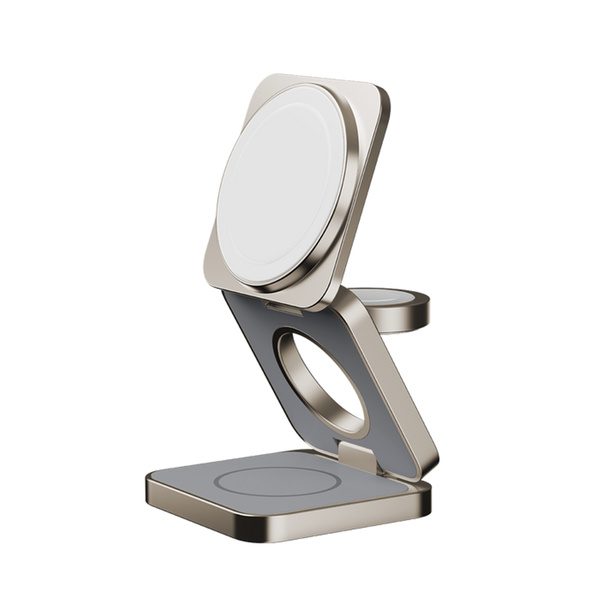 Q2.Mag 3-in-1 Foldable Qi2 15W Magnetic Wireless Charging Stand - Apple Certified, made for Apple Watch- Supports wireless charging of iPhone or Qi-compatible phone, Apple Watch, and AirPods- Qi2 certified safe, wireless charging technology- Adjustable hinge for ideal viewing angle while charging- 360° phone rotation for viewing flexibility- Patented, foldable compact design for travel or on-the-go lifestyle Charge it all, all at once Qi2 Certified Wireless Fast Charging Enjoy the speed and efficiency of Qi2 wireless quick charging of up to 15W. The Q2.Mag is certified made for Apple Watch, ensuring reliable and consistent performance when powering up your devices. Multi-Device Charging Features 3 dedicated charging areas to simultaneously power up your Qi2-compatible phone, Apple Watch, and AirPods, providing a convenient all-in-one charging solution for your essential devices. Compact and Travel-Friendly Design This wireless charging stand features a patented, foldable design that collapses into a compact size, making it the perfect travel-friendly power companion that doesn't take up much storage space. Highly Flexible Viewability Enables you to fully adjust the position of your phone or Qi2 compatible device, allowing you to view it in both landscape and portrait orientations for optimal viewing at any angle. Premium and Durable Design The Q2.Mag 3-in-1 charging stand is made from silicone and aluminum alloy. Experience the convenience of Qi2 certified fast charging of up to 15W for your phone, Apple Watch, and AirPods simultaneously, all in a compact and durable design for seamless multi-device charging on the go. Triple the Charge, Triple the Convenience With dedicated charging areas for your Qi2-compatible phone, Apple Watch, and AirPods, you can power up all your devices at once, eliminating the need to juggle multiple cables and charging stations. Power Up Your Devices in One Place Conveniently charge your devices at once, all in a single, convenient location. This frees you from the hassle of managing multiple charging setups, keeping your workspace or nightstand clutter-free. Perfect Wireless Charging Alignment The charger and device automatically align and easily attach to start charging quickly and conveniently, without the need for repeated position adjustments.