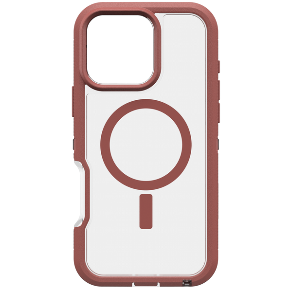 OtterBox iPhone 16 Pro Max Defender Series XT Clear Case - Brick Red Clear - Compatible with iPhone 16 Pro Max- DROP+ 7X as many drops as military standard MIL-STD-810G 516.6 and features a dual-layer design to keep phone securely in place and protected- Equipped with built-in magnets that seamlessly interact with MagSafe chargers and accessories in a clear design to show off your phone- Designed with grippable rubber edges for comfortable hold and tough shock absorption, plus outfitted with anchor points and upgradeable with free holster available post purchase- Trusted OtterBox Quality: With OtterBox, you're not just buying a case; you're investing in peace of mind. For legendary Defender Series protection in a sleek, see-through package, get Defender Series XT for MagSafe. Built to 7X military standard drop defenses, it survived 182 drop tests before we released it. It features a thinner, dual-layer design with a pressure-fitted frame that keeps your device securely in place - and a secure grip. Built-in magnets snap to MagSafe chargers and accessories, and integrated anchors give you extra ways to carry your case. Plus, this MagSafe iPhone 16 Pro Max case has raised edges for added camera and screen defense.