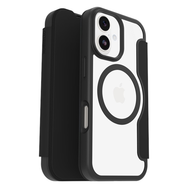 OtterBox iPhone 17 (6.3") React Folio Phone Case - Black/Clear Ultra-thin and resilient, React Series Folio is the thin iPhone case that protects your phone from drops and scrapes. Its solid, one-piece form is precision-fit for your phone, and its textured edges provide a sure grip. The folio cover with a magnetic closure protects your screen and helps to protect your privacy by blocking the view of wandering eyes. Its interior card slot holds essentials like ID, cards or even some cash. Built-in magnets let you snap to MagSafe accessories, opening new ways to use your iPhone. It gives you full Camera Control access for faster photos and videos. Plus, the case installs fast, and it slides in and out of pockets seamlessly. Wrap your phone in the trusted protection of React Series Folio. - Meets Military Drop Standard (MIL-STD-810G 516.6)- Raised edges protect camera + screen- Case resists scratches- Sleek, chic one-piece design- Folio covers touchscreen for added protection- Magnetic folio closure- Card holder secures cash or cards- Built-in magnets work flawlessly with MagSafe accessories- Precision-designed opening gives you full Camera Control access for faster interaction with photos, videos and Apple's visual intelligence- Works with OtterBox Glass