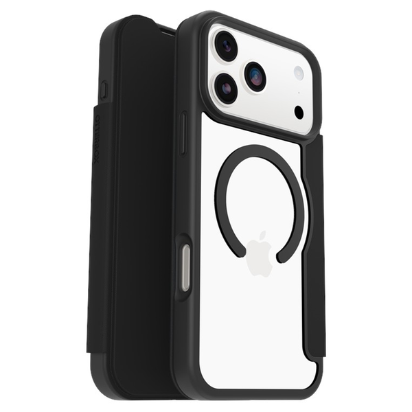 OtterBox iPhone 17 Pro Max (6.9") React Folio Phone Case - Black/Clear Ultra-thin and resilient, React Series Folio is the thin iPhone case that protects your phone from drops and scrapes. Its solid, one-piece form is precision-fit for your phone, and its textured edges provide a sure grip. The folio cover with a magnetic closure protects your screen and helps to protect your privacy by blocking the view of wandering eyes. Its interior card slot holds essentials like ID, cards or even some cash. Built-in magnets let you snap to MagSafe accessories, opening new ways to use your iPhone. It gives you full Camera Control access for faster photos and videos. Plus, the case installs fast, and it slides in and out of pockets seamlessly. Wrap your phone in the trusted protection of React Series Folio. - Meets Military Drop Standard (MIL-STD-810G 516.6)- Raised edges protect camera + screen- Case resists scratches- Sleek, chic one-piece design- Folio covers touchscreen for added protection- Magnetic folio closure- Card holder secures cash or cards- Built-in magnets work flawlessly with MagSafe accessories- Precision-designed opening gives you full Camera Control access for faster interaction with photos, videos and Apple's visual intelligence- Works with OtterBox Glass