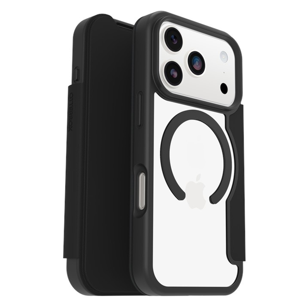 OtterBox iPhone 17 Pro (6.3") React Folio Phone Case - Black/Clear Ultra-thin and resilient, React Series Folio is the thin iPhone case that protects your phone from drops and scrapes. Its solid, one-piece form is precision-fit for your phone, and its textured edges provide a sure grip. The folio cover with a magnetic closure protects your screen and helps to protect your privacy by blocking the view of wandering eyes. Its interior card slot holds essentials like ID, cards or even some cash. Built-in magnets let you snap to MagSafe accessories, opening new ways to use your iPhone. It gives you full Camera Control access for faster photos and videos. Plus, the case installs fast, and it slides in and out of pockets seamlessly. Wrap your phone in the trusted protection of React Series Folio. - Meets Military Drop Standard (MIL-STD-810G 516.6)- Raised edges protect camera + screen- Case resists scratches- Sleek, chic one-piece design- Folio covers touchscreen for added protection- Magnetic folio closure- Card holder secures cash or cards- Built-in magnets work flawlessly with MagSafe accessories- Precision-designed opening gives you full Camera Control access for faster interaction with photos, videos and Apple's visual intelligence- Works with OtterBox Glass