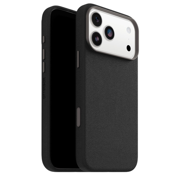 OtterBox iPhone 17 Pro Max (6.9") Symmetry Cactus Leather Phone Case - Black Luxury iPhone case with premium cactus-based leather alternative elevates your style. This iPhone case is refined for elegance - from the metal buttons and inner felt backing to the metal camera crown and razor-thin profile. Not only does this case withstand drops, it also works with Camera Control and has powerful MagSafe magnets for charging. When you want to make a lasting impression, slip on Symmetry Series Cactus Leather Leather case. - 3X tested to Military Drop Standard (MIL-STD-810G 516.6)- Raised edges protect camera + screen- Beautiful cactus-based leather substitute crafted by Desserto from sustainably harvested organic nopal cactus*- Felt backing inside the case for an added touch of elegance- Metal buttons react to touch and elevate the tactile experience- Built-in magnets work flawlessly with MagSafe accessories- Equipped with an integrated Camera Control button for seamless interaction - swipe, click, capture and tap into Apple's visual intelligence fast- Contains a minimum of 45% recycled content- Works with OtterBox Glass- Recyclable retail package *Cactus Leather-based leather substitute is organically grown without the need for irrigation and harvested sustainably twice a year to protect the cacti
