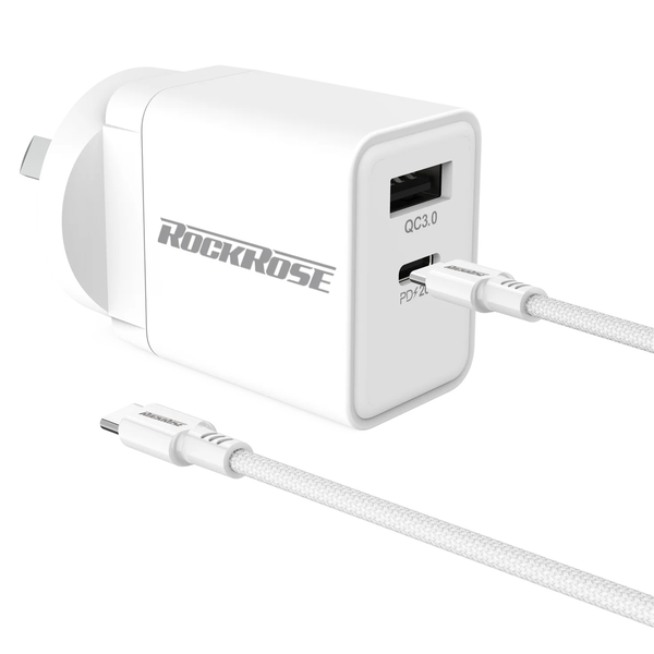 Rockrose Casa AC Pro Combo 20W PD & QC 3.0 Dual Port Power Adapter With 1M PD 100W USB-C to USB-C Fast Charging Cable