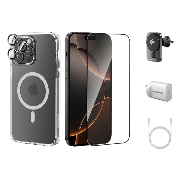 RockRose iPhone 16 ( 6.1" ) 6 in 1 Colletction Kit - Including 30W Power adaptor , 1M 100W USB-C cable , Magsafe Wireless Car Charger , Magsafe Phone Case , Screen Protector , Camera Lens Screen Protector