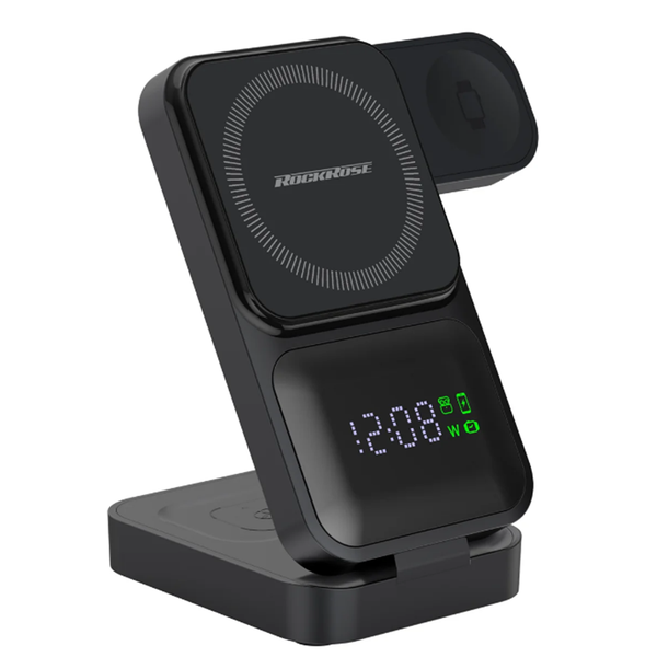 Rockrose AirWave Mate 3-in-1 Foldable Wireless Charger Digital Clock &; Power Display - 15W Max Output - 3-in-1 Wireless Charging- 15W/10W/7.5W/5W Compatible - Foldable Stand