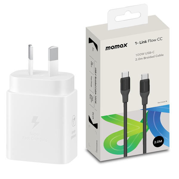 Samsung 25W USB-C PD Fast Charging GaN Wall Charger - White With Momax 1-Link Flow 100W 2M USB-C To USB-C PD Fast Charging Cable Black - Support Samsung Super Fast Charge & iPhone PD Fast Charging