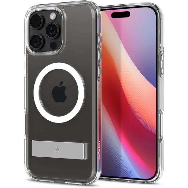 - Crystal clear phone case with a built-in magnetic ring compatible with MagSafe accessories- Built-in kickstand made of durable metal for ultimate viewing comfort- Slim protection design made of flexible TPU bumper and hard PC back- Air cushion technology on all corners for shock absorption- Raised bezels for screen and camera protection off flat surfaces- Precise cutouts and pronounced buttons for easy accessibility