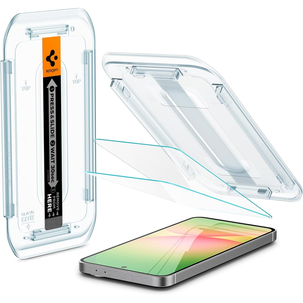 Spigen Premium Tempered Glass Screen Protector Galaxy A56 5G (2025)/S24 FE 5G - 2 Pack Save your screen and your time. EZ Fit makes installing a screen protector hassle-free. Use the tray to align the screen protector onto your Samsung Galaxy press down, and you're good to go. Easy does it. - Includes an innovative, auto-alignment installation kit for effortless front screen application- Glas.tR EZ FIT - Tempered front screen glass protector durability rated at 9H hardness- Oleophobic coating for daily fingerprint resistance- Extreme clarity preserves the original screen brightness- Made case compatible with every Spigen Galaxy A56 5G / Galaxy S24 FE case- Compatible with Samsung Galaxy A56 5G (2025) / Galaxy S24 FE (2024)