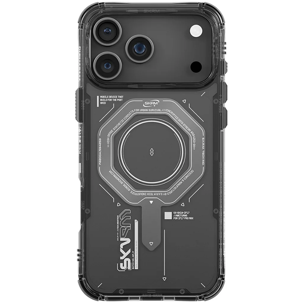 Mech-tech edge with all-round protection. MAGMA pairs a sleek semi-clear case with a metallic-style Mag-Charge ring and aluminium side buttons for a mech-inspired look. Comes with interchangeable corner lanyard loops for customisable carry. - 8-feet drop protection - Raised camera lens guard- Air pockets for shock absorbent protection- Magnet ring module for magnetic charging- Aluminium power and action buttons- Interchangeable corner bumper lanyard loops included