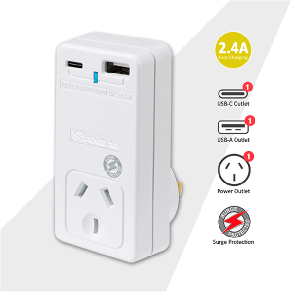 Sansai USB-C + A Wall Charger, 2.4A Recharge and power your USB powered devices without the need for a computer. The unit features 2 x USB charging outlets, a power status indicator and a surge protection 240V outlet. - 1USB-A &; 1 USB-C Charging ports- Rating: 240V a.c. 50Hz, 10A, 2400Watts max.- USB-A&;C: 5V dc, total max. 2.4A- With Surge protection- 1x 240V mains outlet- Power status indicator- Slimline design- Packing: Clamshell Packing, 12/96