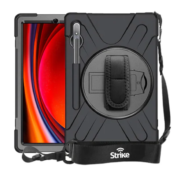 The Strike Rugged Case with hand strap and lanyard for the Samsung Galaxy Tab S10 Ultra/S9 Ultra/S8 Ultra fully protects your device from dust, dirt, shock, scratches, and dents with its dual-layer protection. This Samsung Tab S10 Ultra/S9 Ultra/S8 Ultra shockproof case with shoulder strap features a kickstand for comfortable horizontal or vertical viewing. Its hand strap provides an easy grip on your device that further prevents drops. Choose to carry your Samsung Galaxy Tab S10 Ultra/S9 Ultra/S8 Ultra hands-free wherever you go with its detachable shoulder strap - made with a soft pad to rest comfortably on your shoulder. Ultimate Protection Highly durable rugged case for Samsung Galaxy Tab S10 Ultra/S9 Ultra/S8 Ultra, safeguarding against drops, bumps, and scratches. Enterprise-Grade Tablet Case Designed for field workers in demanding conditions, suitable for warehousing, logistics, manufacturing, and transportation. Military-Standard Compliant Samsung Galaxy Tab S10 Ultra/S9 Ultra/S8 Ultra tough case built to meet US Department of Defense MIL-STD-810G 516.7 standards. Dual-Layer Defense Features a dual-layer design with a tough PC outer shell and high-quality silicone inner layer. 360° Rotating Kickstand Enjoy hands-free viewing with a versatile kickstand. Secure Hand Strap Samsung Galaxy Tab S10 Ultra/S9 Ultra/S8 Ultra shockproof case with adjustable hand strap for a comfortable and secure grip. Versatile Lanyard Detachable and adjustable lanyard for carrying convenience during travel and outdoor activities. Easy Access Design Quick access to charging port, jacks, buttons, and raised camera port for lens protection.