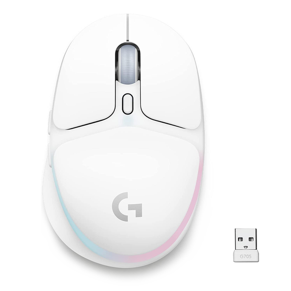 IT JUST CLICKS G705 Wireless Gaming Mouse from the Aurora Collection is shaped for smaller hands, contoured for comfort, and fully equipped for your best play experience yet. Dreamy aesthetic included. GOOD GAME, ALL DAY Never one to cramp your style (or your hands) G705 is intentionally designed to be inclusive of those with smaller hands. Compact form and sculpted thumb rest, and gliding feet deliver comfy play for hours on end. This one knows the lasting power of a good contour. MADE TO PLAY TO GO Places to go, people to see, and worlds to explore? Same. With gaming-grade LIGHTSPEED wireless and Bluetooth connectivity, you can take your conquests to lands afar or to friends close by. Connect G705 to the G715 Wireless Gaming Keyboard receiver simultaneously with one USB receiver to declutter your gaming space. Escape to anywhere, from everywhere, with a USB-C rechargeable, 40-hr battery life with lighting on COMPACT. POWER PACKED. You're in control with a gaming-grade sensor, wireless or wired play flexibility, and an easy-reach DPI-cycling button. All weighing in at just 85 grams. This ultralight mouse is designed for comfort and precision. LIGHTSYNC AT YOUR FINGERTIPS With three ethereal RGB zones flowing together, you can show off your style out of the box. Four immersive Play Mood animations, the signature lighting for the Aurora Collection, come preloaded. You can also customize your RGB with G HUB to make it all your own. DIAL IN YOUR GEAR WITH G HUB Stay centered with a perfectly styled and fine-tuned gaming mouse. Go with preloaded Play Moods LIGHTSYNC RGB animations, choose from a variety of additional effects, or create your own. And G705 is equipped with 6 programmable buttons including two critical thumb buttons and a top-mounted DPI-shift button. Get into G HUB and program each button to do just about anything you'd like.