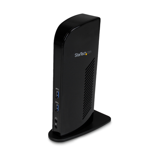 The USB3SDOCKHD Universal USB 3.0 Laptop Docking Station with DVI, HDMI, Audio and Ethernet adds dual video outputs, headphone and microphone jacks, as well as Gigabit Ethernet and additional USB 3.0 and USB 2.0 ports to a laptop computer, all from a single device and over a single SuperSpeed USB 3.0 connection. Offering flexible dual video combinations right out-of-the-box, this versatile universal docking station features HDMI and DVI external monitor outputs, as well as an included DVI to VGA adapter. Plus, each of the video outputs provided by the docking station supports video resolutions up to 1920x1200 and HD video playback - an ideal solution for adding robust video capability while remaining conveniently mobile. An all-in-one mobile solution, the universal laptop docking station combines USB 2.0 and USB 3.0 hubs, headphone and microphone audio connectors and a Gigabit Ethernet RJ45 port into a single docking station, making it the perfect accessory for enhancing your laptop's capabilities. With an upright design, the dock occupies minimal desk space, so it's perfect for hoteling or hot desk environments.