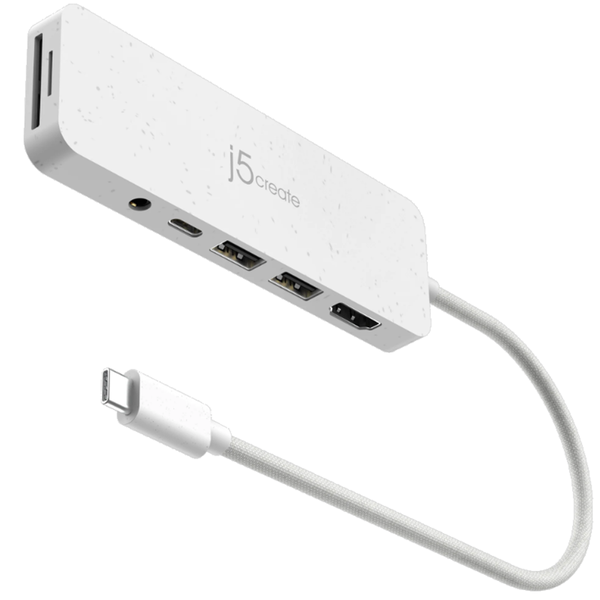 Our JCD373E Eco-Friendly USB-C® Multi-Port Hub with Power Delivery provides extra connectivity for your computer. This pocket-sized multi-adapter with 2 USB™ 3.2 Type-A ports for connecting peripherals such as an external keyboard, mouse, or USB™ flash drive. With high-speed transmission up to 5Gbps, data transfer is quick and easy. The HDMI™ port allows you to mirror or extend your screen and directly output 4K UHD to a HDTV, monitor, or projector. Equipped with a USB-C® Power Delivery 3.0 charging port, it offers charging up to 100W when connected to a USB-C® power adapter. The hub also provides direct access to your SD™ &; microSD™ memory cards. The audio/mic combo jack allows you to connect your headphone set or speakers. Eco-friendly, Made with Recycled Material Crafted with recycled materials to protect the environment and promote a sustainable future Sustainable Packaging The packaging is made with a mixture of materials from FSC-certified forests and recycled materials, and use paper wrap instead of plastic to protect the product. 7-in-1 Functions Connect video, data, and power to a computer or tablet with a single USB-C® port. Crisp and Clear 4K Content The HDMI™ port allows you to mirror or extend your screen and directly output 4K UHD @ 30 Hz video to an HDTV, monitor, or projector USB™ 3.0 ports with 5Gbps Transfer Speed Allows you to connect an external keyboard, mouse, or USB™ flash drive. 100W Power Delivery Passthrough Power Delivery 3.0 allows you to fast charge your mobile devices at a much faster rate Additional Data/Media Storage Allows for external memory access up to 2 TB, supporting microSD™ and SD™ 3.0 UHS-I with data transfer speeds up to 104 MB/s. Perfect for on-the-go All the ports you need, wherever you go, in one multi-port adapter 3.5 mm Audio/Mic Jack Connect your headphones or a speaker and listen to music from your laptop Connect Effortlessly Connect your headphones or a speaker and listen to music from your laptop Universal Compatibility Works with a variety of USB-C® enabled devices, including tablets and phones