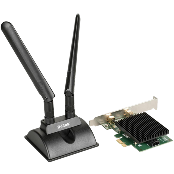 AX3000 Wi-Fi 6 PCIe Adapter with Bluetooth 5.1 - DWA-X3000 - Enhanced data speeds up to 2.7x faster than previous standards- Multiple adjustable antennas ensure high speeds and unbroken connections- Magnetised antenna base allows fine-tuning of antenna positioning, while keeping it firmly secured in place once set- Easy installation, fits into any standard PCIe interface- Headphones, mice, keyboards and even game controllers stay reliably connected thanks to Bluetooth 5.1- Supports WPA3™ encryption - the latest Wi-Fi security for greater protection- Heatsink maintains optimal operating temperatures even when the heat is on