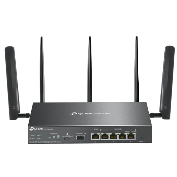 - 4G+ Cat6 up to 300 Mbps- 2402 Mbps + 574 Mbps*- 6× Gigabit Ethernet Ports- 1× Nano SIM Card Slot- IPSec/SSL/ WireGuard /OpenVPN/L2TP VPN- Centralized Management- Load Balancing- Omada App Get Instant 4G+ LTE Internet up to 300 Mbps Always-Online with AX3000 WiFi 6 Seamless Integration into Omada SDN Easy Management with the Omada App *Maximum wireless signal rates are the physical rates derived from IEEE Standard 802.11 specifications. Actual wireless data throughput and coverage are not guaranteed and will vary. **Actual 4G downlink speeds vary between buildings. Factors affecting 4G speeds include the internet service plan, real-time network capacity, equipment and client limitations, and environmental factors. *?Omada Mesh Technology requires the use of EAPs that support mesh functionality. Please refer to https://www.tp-link.com/en/omada-mesh/product-list/ to confirm which Omada EAPs are compatible with Omada Mesh. Additionally, ER706W-4G also supports standalone mesh. Please refer to https://www.tp-link.com/en/standalonemesh/product-list/ to confirm the specific models. ‡Use of WiFi 6 (802.11ax) and its features, including OFDMA, HE160, and 1024-QAM, requires clients to support the corresponding features. The 160 MHz bandwidth is only available on the 5 GHz band. It may be unavailable in some regions or countries due to regulatory restrictions. ?For PPTP VPN and L2TP VPN, ER706W-4G can connect with up to 10 VPN servers. For OpenVPN, ER706W-4G can connect with up to 5 VPN servers. †These functions are supported only in Standalone Mode. §These functions are supported only in Controller Mode.