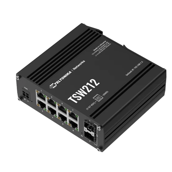 TSW212 is an L2 Teltonika Networks managed switch with additional L3 features, like DHCPv6 client support and static IPv6 routing for greater network management. This switch supports multiple industrial protocols, including EtherNet/IP, PROFINET, and MRP, and has 8 Gigabit Ethernet ports and 2 SFP ports to ensure robust long-range fibre optic communication. Encased in rugged aluminum housing, the TSW212 excels in withstanding extreme temperatures and resisting severe vibrations - all with effortless installation thanks to an integrated DIN rail mount. - L2 with additional L3 features for advanced management capabilities- Supports Profinet for automated data processing alongside other protocols, like EtherNet IP and MRP- 8 x Gigabit Ethernet ports and 2 x SFP ports for fibre optic communication- Teltonika Networks OS for switches, intuitively designed for infinite configurations- Configure via RMS