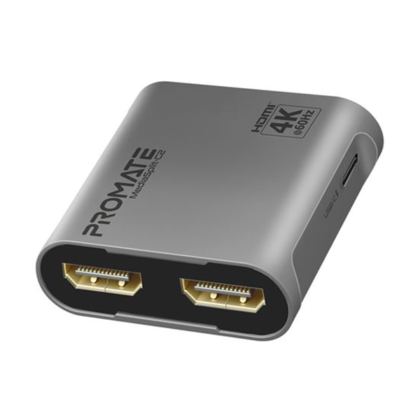 PROMATE HDMI Splitter with Dual HDMI Ports. Supports up to 4K@60Hz Play Content on 2x Monitors Simultaneously. USB-C Port (5V,500MA). Easy Plug &; Play. MediaSplit-C2 is designed to transmit both audio and video signals from one HDMI source to two HDMI TVs or Monitors simultaneously. Multiple resolutions of up to 4K@60Hz are supported therefore providing crisp vibrant video quality without any lag or drop-off. 2-in-1 HD Clarity Connect one HDMI source to play simultaneously on two HDMI TVs or Monitors to project in high-definition clarity 4K@60Hz Support Supports multiple resolutions up to 4K@60Hz for crisp vibrant video quality Wide Compatibility MediaSplit-C2 is compatible with all devices supporting Video/Audio output Plug &; Play With the convenience of plug &; play support, you will not have to waste time trying to get your display setup USB-C Port Power the MediaHub-C2 seamlessly through the USB-C port