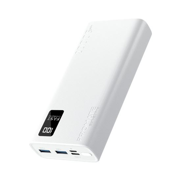 PROMATE 20000mAh Power Bank with Smart LED Display & Super Slim Design. Includes 2x USB-A & 1x USB-C Ports. 2A (Shared) Charging. Auto Voltage Regulation. Charge 3x Devices. White Colour.