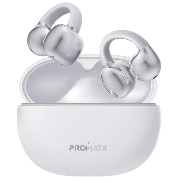 Promate AIRCLIP-WHT Open Ear Clip-on Bluetooth Earbuds with Intellitouch Smart Control.Includes500mAh Recharging Battery Case, Up to 28 Hours Play Back, Water Resistant, White