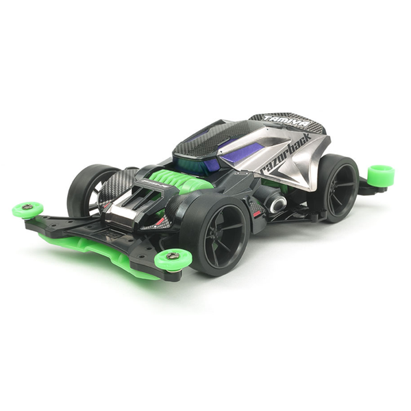 Mini 4WD REV Series no.13 - Razorback (FM-A Chassis) Time to Raz-or Your Game This assembly kit creates the Razorback, a stylish Mini 4WD racer which won the TOP AWARD in the 2018 Mini 4WD Design Contest held in Japan. Its naming and design are inspired by a species of wild boar, with additional themes drawn from hot rod machines. The body is molded in gun metal color ABS resin. Also included in the kit are FM-A chassis parts, plus metallic stickers to decorate the body with. FM-A: Aerodynamic Front Motor Chassis The FM-A chassis is a front motor unit with advanced aerodynamic themes that - thanks to its center of gravity toward the front - is at home on a whole variety of track types including those with frequent elevation changes. It comes equipped with a low-friction front skid bar, while the chassis underside allows easy access to the motor and quick setup changes. Aircraft-inspired aero side stays allow attachment of a range of Grade-Up parts. The chassis is molded in durable black ABS, with low friction A parts such as underpanel in light green. Dark silver color 6-spoke wheels are combined with low-profile tires, and the model includes a motor and 4.2:1 gears. Note: Images show painted and assembled kit. The front motor layout FM-A chassis is a cutting edge design, and comes in coordinated black and light green. The car has a different air when viewed from the rear. The FM-A motor cover is incorporated into the design. Slits in the rear section of the body help channel air, while damper and taillight details give great realism. An underside view of the FM-A chassis, great on undulating circuits thanks to its front-weighted layout.