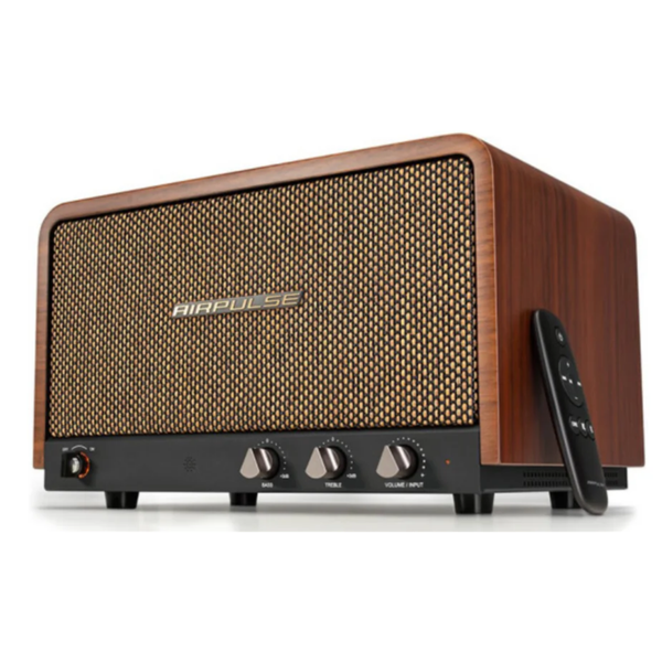 The AIRPULSE P100X is a multi-driver wireless desktop speaker system. Designer of P100X packs multiple drivers into the system, including a pair of patented A-Blade tweeters, and one proprietary 4.5-inch long-throw mid-woofer with an Aluminum diaphragm. With Qualcomm Bluetooth audio receiver and high-end digital power amplifier platform, all components are fine-tuned to work together seamlessly, housed in this well-constructed compact size cabinet with a retro appearance. Elegant Appearance Covered with real-wood Walnut veneer, P100X's cabinet is finished with high-grade furniture paint. With exquisite craftsmanship and elegant appearance, it can easily blend into any style of home decoration. Its all-in-one acoustic design allows unrestricted positioning. You can place it anywhere you want music to be heard THE AIRPULSE A-BLADE TWEETERS The patented A-Blade tweeters, designed by Mr. PHIL JONES, features a far more smoother frequency response and can out-perform any normal dome tweeter. The form factor of the oval-shaped diaphragm brings in special acoustic character, which helps to disperse high frequencies more efficiently. One prominent feature the A-Blade tweeters bring about is the minimum impact of speaker positioning. You can walk around while still experience the same sound effect, no need to seek the "Sweetspot"! TRANSPARENT SPEAKER WIRE The P100X uses US-made TRANSPARENT wire which is known for its high degree of accuracy and resolution. This accurate signal transmission further enhances the performance of the tweeter and mid/woofer in the system to give you a fulfilling musical experience. 4.5 INCH ALUMINUM DIAPHRAGM WITH LONG-THROW MID-WOOFER The proprietary 4.5-inch long-throw mid-woofer with an Aluminum diaphragm effectively controls sound colorization caused by diaphragm partitioning, which greatly reduces speaker coloration and it can "dive-down" deeply. The use of passive radiators not only enhances low frequencies but also eliminates the possible wind noise caused by the bass reflex port, to maintain the distinctive pure and natural tonal characters of the PHIL JONES design. BLUETOOTH V5.0 WITH APTX HD Bluetooth receiver of P100X is Qualcomm's latest V5.0 chipset QCC3031, which can support aptX HD codec, offering a lower distortion, higher resolution Bluetooth audio effect than traditional SBC codec. ULTRA-LOW DISTORTION DIGITAL POWER AMPLIFIER SYSTEM P100X features two pieces of TAS5805M Class D amplifier from Texas Instrument. One of the amplifiers is connected in BTL mode to drive the two Air-Blade tweeters, the other one is connected in PBTL to drive the woofer. TAS5805M is among Texas Instrument's new line of Close-loop Class D amplifiers, featuring a digital input with up to 96KHz sample rate support, and maximum 45W output power in PBTL mode. Its 768KHz output PWM carrier frequency is ideal for rendering high-resolution sound and driving high sensitivity drivers like the Air-Blade. TAKE CONTROL OF YOUR SOUND The P100X comes with a wireless remote control used for taking control of your sound. You can switch between inputs easily from the comfort of your seat.