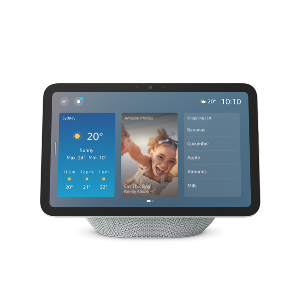 POWERFULLY SMART, BEAUTIFULLY BUILT - The seamlessly designed 8.7'' smart display features a vibrant HD touchscreen, fast performance, and a built-in smart home hub. YOUR FAVOURITE CONTENT SOUNDS INCREDIBLE - Enjoy your favourite music and shows with the power of room-filling spatial audio. THE BEST KITCHEN ASSISTANT - See recipes and tasty meal ideas at a glance, set timers, and add items to your shopping lists. SIMPLE SMART HOME CONTROL - Pair and control thousands of devices that work with Alexa without needing a separate smart home hub. Easily view your camera feeds to stay in the know. Manage lights, thermostats, and more using the display or your voice, or activate routines via motion. CRYSTAL-CLEAR VIDEO CALLS - Video calls will feel natural with a centred, auto-framing camera, 3.3x zoom, and noise reduction technology. Use live view to check in on your family, pets, and more while you're away. ON DISPLAY, YOUR PHOTO MEMORIES - Turn your home screen into a stylish digital photo frame when not in use. DESIGNED TO PROTECT YOUR PRIVACY - Amazon is not in the business of selling your personal information to others. Built with multiple layers of privacy controls, including a microphones &; camera enable/disable button, and dedicated camera controls on device and in-app. Form meets flow Meet your versatile smart display and endless entertainment hub, all in one.Beauty is in the details New sleek display and refined base for a smart display that doubles as a style statement. Beauty is in the details New sleek display and refined base for a smart display that doubles as a style statement.Cook along with a podcast or watch a show while washing up-the content you love is here. Now playing-your favourites Cook along with a podcast or watch a show while washing up-the content you love is here. Easy smart home control Create routines using your Alexa App or control multiple devices at once with a few taps. Everyday wins, front and centre Get recipe help and ideas at a glance, keep your favourite photos on display, and video chat with your favourite people.Clear catch-ups Video calls will feel natural with a centred, auto-framing 13MP camera and noise reduction technology. Clear catch-ups Video calls will feel natural with a centred, auto-framing 13MP camera and noise reduction technology.Yes, chef! Echo Show 8 is your perfect kitchen assistant-find recipes, meal ideas, and add items to your shopping lists. Yes, chef! Echo Show 8 is your perfect kitchen assistant-find recipes, meal ideas, and add items to your shopping lists.Memories on view Turn your home screen into your personally curated digital photo frame when not in use. Memories on view Turn your home screen into your personally curated digital photo frame when not in use. Designed to protect your privacy Alexa and Echo devices are built with multiple layers of privacy protection. Privacy at the press of a button Echo smart displays have a built-in microphones &; camera enable/disable button that mutes the microphones and camera. In-app and on-device camera controls You can enable or disable the camera with on-device or in-app controls. Continue interacting with Alexa when the camera is disabled. Manage your Alexa experience You have transparency and control over your Alexa experience. You can manage privacy settings, including reviewing and deleting your voice recordings, at any time in the Alexa app or on device