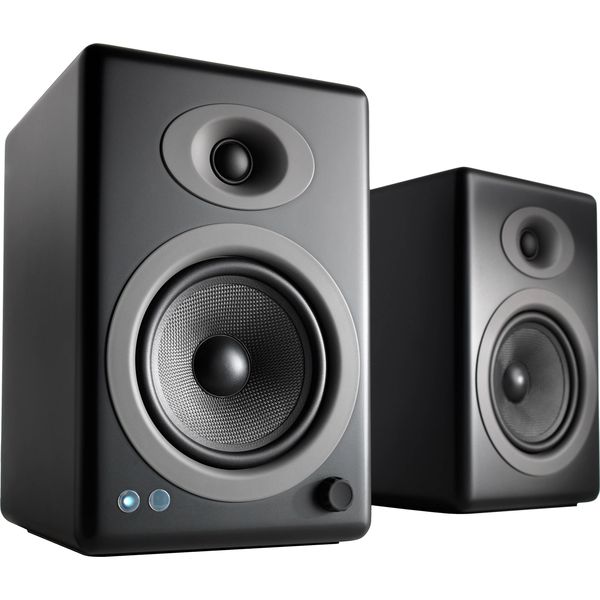 Enjoy your audio from nearly any source with the satin black Audioengine A5+ Wireless Bluetooth Speaker System. This system features Bluetooth with aptX HD technology for wireless connectivity, plus stereo RCA and 1/8" inputs for traditional wired devices. The A5+ Wireless has a 2-way design with a built-in 50W RMS per channel amplifier. Each speaker sports a 5" Kevlar woofer and a 0.75" silk dome tweeter, and the system includes an aluminum remote control. Integrated Design The speaker cabinets, drivers, bass ports, amplifiers, and passive crossovers are all tuned together, helping to provide a more efficient speaker system that requires less power than passive speakers and a separate amplifier or similar component. With all the electronics built into the left speaker, it's simple to connect your favorite audio device. Bluetooth Audio The Bluetooth built into the A5+ Wireless features aptX HD coding for enhanced sound quality when paired with an aptX HD-enabled source device; it's also backward-compatible with the SBC and AAC codecs for universal Bluetooth compatibility. aptX HD also allows for a broader Bluetooth range - up to 100' - for multi-room use. 24-Bit DAC The A5+ Wireless uses the AKM AK4396A DAC for upsampling, helping to achieve a higher signal-to-noise ratio and a lower noise floor. Amplifier Design The amplifiers in the A5+ Wireless are located in the left speaker and features a Class-A/B analog monoblock design. This is engineered to provide enhanced audio quality and flexibility, and all the circuit boards for the power and preamp sections are vertically mounted for augmented mechanical shock protection. Driver Design The A5+ Wireless speakers use ferrofluid-cooled silk-dome tweeters with neodymium magnets. Silk tweeters are designed to hold up well under high power, and the edge-driven design helps provide a smooth response. The woofers are Kevlar woven-glass aramid composite with rubber surrounds. Kevlar helps the woofer retain its shape when being driven at high levels. The woofers are housed in cast-aluminum frames, which help provide high rigidity and high heat dispersion. Power Transformers Power transformers are critical to audio performance, particularly in the low-end. The A5+ Wireless speakers use gapless-core toroidal transformers, which are designed with a tighter radiated magnetic field, translating to lower noise. They are lighter than the more common "EI" transformer and generate less heat. Magnetic Shielding Both of the A5+ Wireless speakers are magnetically shielded for safe placement near other electronics.