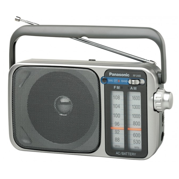 Portable Radio RF-2400D - Portable FM/AM Radio with New Tuner This simple, easy-to-use FM/AM radio features a Universal Design for easy viewing and a new tuner for easy and stable tuning. It operates with either an AC adaptor or 4x AA batteries (sold separately), so it can be easily used in the living room and carried outside when desired. - Easy and Stable Tuning: New Tuner with AFC- Crisp, Clear Sounds: 10cm Full Range Speaker- Easy-to-See Design: Large Dial Scale