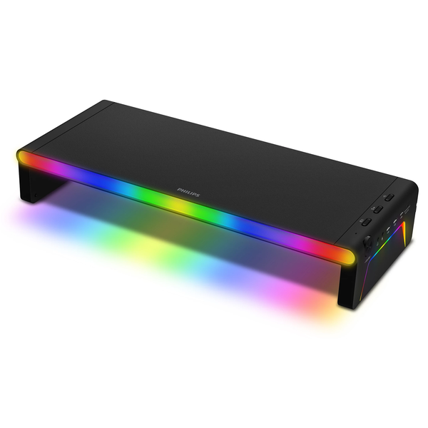 - All-in-one monitor stand- Built-in speakers- RGB LED strip lights- Integrated docking station Space saving. Atmosphere enhancing. Short on space? This versatile all-in-one stand and docking station elevates your monitor, desktop PC, or laptop to the perfect height. The built-in speakers enhance the sound of games or work calls-and the lightshow brings the atmosphere. Space saving built-in speakers. 10 W (RMS) Integrated speakers bring you surprisingly powerful, well-balanced audio, letting you enhance the sound of games or work calls without cluttering your desk. You'll hear more of the environment when you're gaming-and work calls will come through loud and clear. Plays music too! Bluetooth® connectivity and USB hub Bluetooth® connectivity lets you stream music from your phone or tablet straight to this monitor stand's speakers. If your computer's on, you can also plug a USB drive into one of the stand's USB-A slots and play music that way. Sturdy desktop organizer, supports up to 15 kg The sturdy construction is more than capable of supporting a standard monitor. When space is more limited, you'll appreciate the ability to store full-sized keyboards or a laptop, plus your phone and tablet, underneath the stand. Integrated docking station for all your essential devices Connect a 65W PD fast-charging power adapter (not supplied) to this monitor stand to enjoy all the functions of the onboard docking station. A USB-C port lets you connect and charge a laptop or tablet, and there are 3x USB-A ports for keyboards, mice, and other peripherals. You also get mic-in and headphone-out ports. Atmosphere enhancing RGB LED lights RGB LED strips on the front, sides, and underside of this monitor stand can amplify the vibe of your favorite games-or enhance the atmosphere for work or relaxation. Three dynamic modes sync colorful light combinations in time to music or sound effects, two ambient modes give you static lighting, and the final mode lets you turn off the lights.