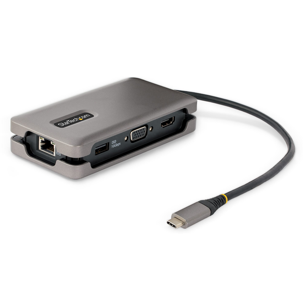 Connect this USB Type-C Multiport Adapter to a USB-C, USB4, or Thunderbolt 3/4™ laptop to enable single-display 4K 60Hz HDMI 2.0b or 1080p 60Hz VGA video output via DP Alt Mode. The USB-C dock works with USB Type-C laptops or tablets, such as a Chromebook, Dell XPS, or MacBook. It features a 3-Port USB 3.2 Gen 2 (10Gbps) Hub (2x USB-A, 1x USB-C), and Gigabit Ethernet. Connect the laptop USB-C power supply to the dedicated USB Power Delivery (PD) 3.0 port, to charge the laptop. Extra-Long Cable with Built-in Cable Manager The Multiport Adapter features an extra-long attached 12.6in. (32cm) USB-C host cable. The Thermoplastic Elastomer (TPE) cable jacket is softer and more flexible than PVC jacketed cables. The extra-long cable reduces port/connector strain, particularly when laptops are placed on riser stands, or on 2-in-1 devices with raised USB-C ports, such as the Microsoft Surface. In addition, the Multiport Adapter also features an innovative wrap-around cable manager that facilitates tangle-free storage in a laptop bag. USB 3.2 Gen 2 Hub Connect one USB-C and two USB-A peripherals to the USB 3.2 Gen 2 (10Gbps) ports. Multiple Applications A versatile solution for adding docking station capabilities in an office, home office, hotel, or in the boardroom. It's portable enough to be carried in a bag or backpack. This lightweight USB-C Adapter can operate with bus-power alone or connect a USB-C power adapter (not included with Multiport Adapter) for laptop charging. USB PD 3.0 features Fast Role Swap (FRS) to prevent USB data disruption when disconnecting the power source. Wired Gigabit Network Connectivity The Gigabit Ethernet port ensures reliable wired network access, with support for PXE Boot and Wake-on-LAN (WoL). - USB-C MINI DOCKING STATION: USB-C to HDMI 2.0b (4K 60Hz) or VGA 1080p for connectivity to a monitor or display, 100W Power Delivery Pass-Through, 3-Port USB 3.2 (10Gbps) hub (2x USB-A, 1x USB-C); Gigabit Ethernet Port (PXE boot/WoL) - CABLE MANAGEMENT: Thoughtful hideaway tethered design prevents cable clutter; The attached 1ft / 32cm long cable reduces strain on the USB-C laptop connector, while shorter cables common in other adapters create strain on the laptop USB-C connector - RELIABLE PERFORMANCE: Prevent device dropouts, video flickering, and power overdraw common in other mini docks; Up to 100W PD Pass-Through with 84W for the laptop while reserving 16W for the adapter and attached devices - UNIVERSAL COMPATIBILITY: Works with all major operating systems (Windows, ChromeOS, macOS, Linux), and all hardware platforms including Intel, Apple M1 / M2, and AMD; Works with USB-C, USB4, Thunderbolt 3 &; 4 - CONNECTIVITY TOOLS: Includes Network MAC Address Pass-Through, WiFi Auto Switching, USB Event Monitoring, and Windows Layout Utilities for IT Pro's and IT help-desk support teams; These tools are not included with docks from consumer brands