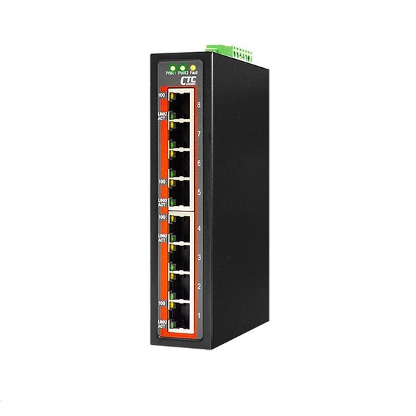 CTC UNION 8 Port Fast Ethernet Unmanaged Switch. 8x10/100BaseT(X). -10° to 60° C. Power consumption 12/24/48VDC/3.9W. Din-kit inc. This series models are non-managed industrial grade gigabit switches with 4 or 8 10/100/1000Base-T ports and 0~2 fibre ports, that provide stable and reliable Ethernet transmission.Housed in rugged DIN rail or wall mountable enclosures, these switches are designed for harsh environments, such as industrial networking, intelligent transportation systems (ITS) and are also suitable for many militaries and utility market applications where environmental conditions exceed commercial product specifications. Standard operating temperature range models (-10°C to 60°C) and wide operating temperature range models (-40°C to 75°C) fulfil the special needs of industrial automation applications.